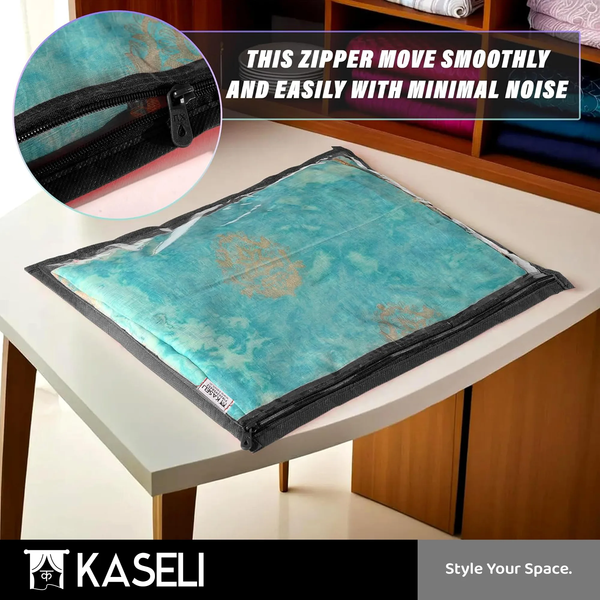 Each saree cover features a smooth zipper closure for easy access and secure storage. The elegant black color gives a premium and classy look to your wardrobe, while the compact and foldable design helps save space.